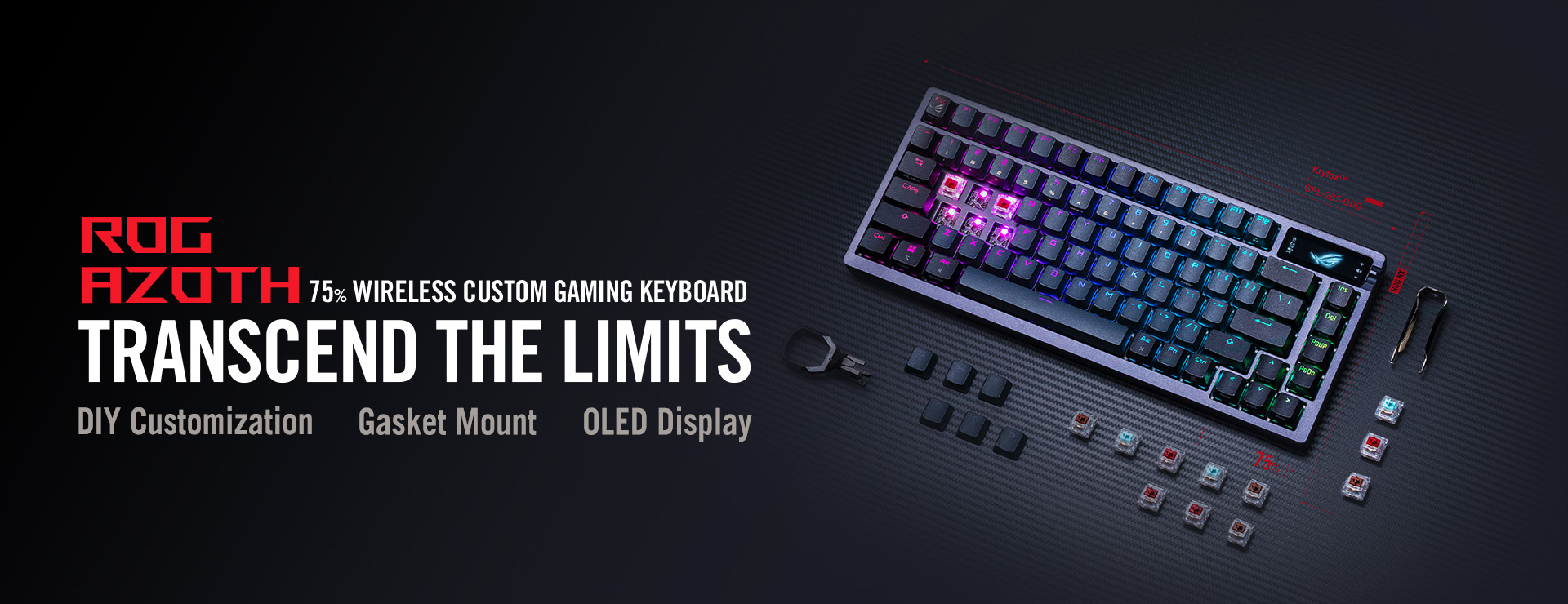 ASUS ROG Azoth 75 Wireless DIY Custom Gaming Keyboard, écran OLED, montage par joint, amortissement à trois couches, interrupteurs et stabilisateurs de clavier ROG NX Red remplaçables à chaud, capuchons de touches en PBT, RGB-noir
